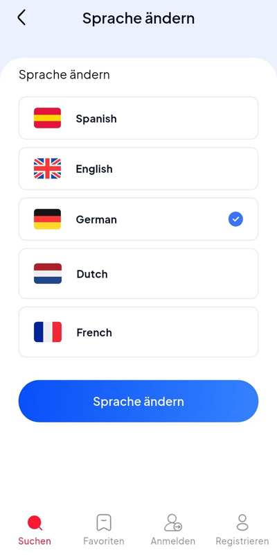 Ändern Sie hier die Sprache auf Deutsch, Spanisch, Französisch, Englisch oder Niederländisch.